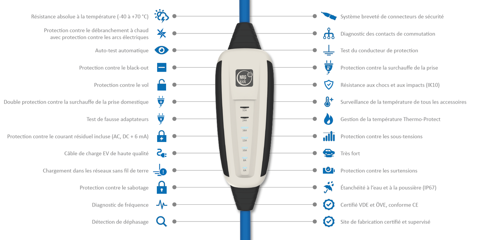 La sécurité est une priorité pour NRGkick, avec des mesures couvrant trois domaines clés : la sécurité du réseau électrique, la sécurité du processus de charge, et la sécurité totale pour l’utilisateur. Grâce à des protections avancées telles que l’autocontrôle avant chaque démarrage, le contrôle du conducteur de protection, et la protection contre le débranchement à chaud, NRGkick dépasse largement les normes de sécurité requises.