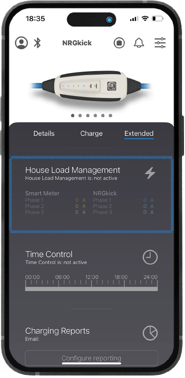 NRGkick is in staat om het totale stroomverbruik van de woning mee te nemen bij het opladen van de elektrische auto en zo stroomuitval te voorkomen. Door verbinding met een communicatief slimme meter regelt NRGkick automatisch de laadstroom en voorkomt overbelasting van de huisaansluiting. In de NRGkick-app kan onder het punt Huislastbeheer een maximale limiet (in ampère) worden ingesteld.